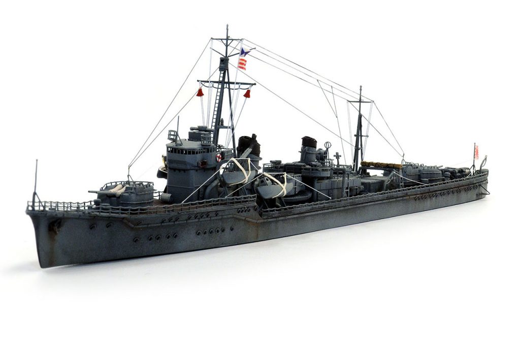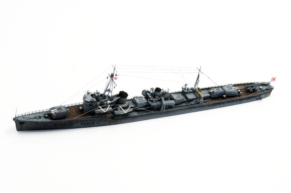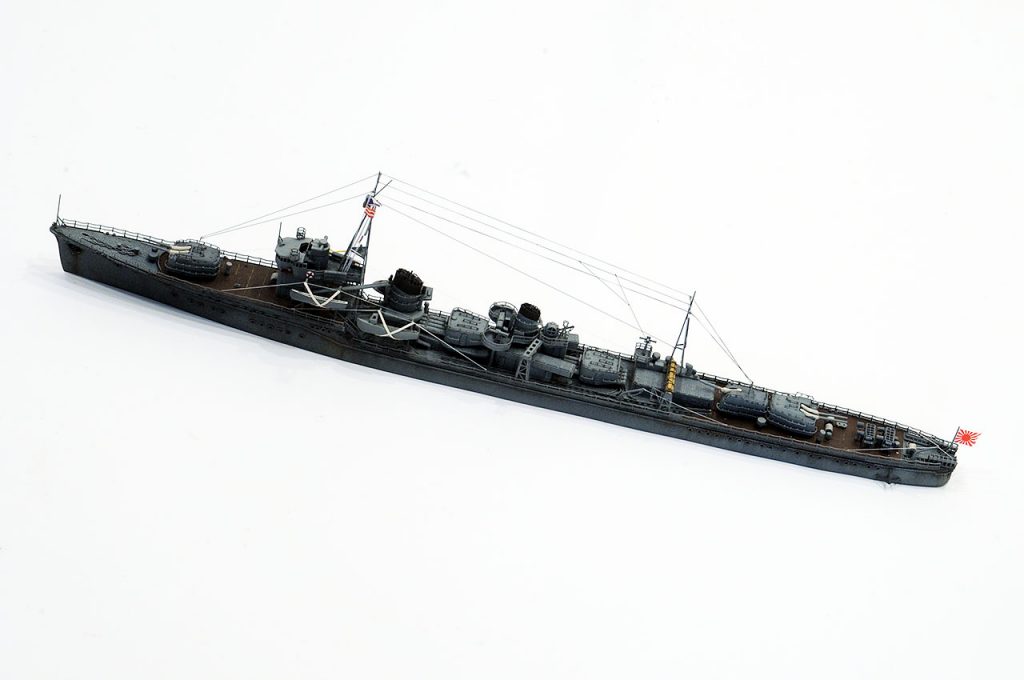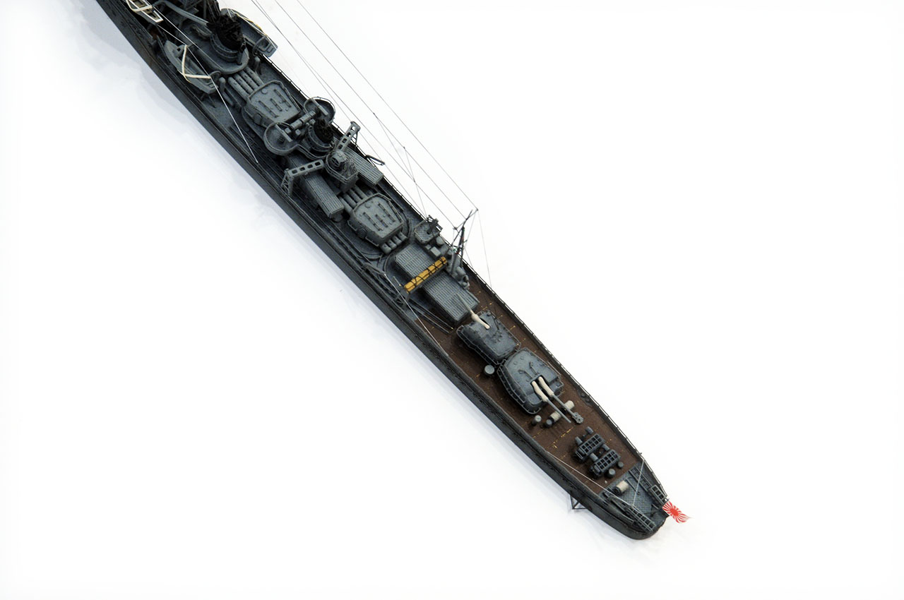 白露型3番艦、あたりまえのように中央構造物機銃座には25mm機銃や13mm機銃が座ってるかとおもいきや毘式40mm対空砲です。Wikiには40mm単装機銃 2基としか記述がありませんが、毘とはヴィッカース (Vickers)社のヴィ(毘)から来ていて、あの英国海軍のポンポン砲(POM-POM)と同じものです。故障が多くホッチキス製(保式)の13mm、25mmへ置き換えられていったようです。